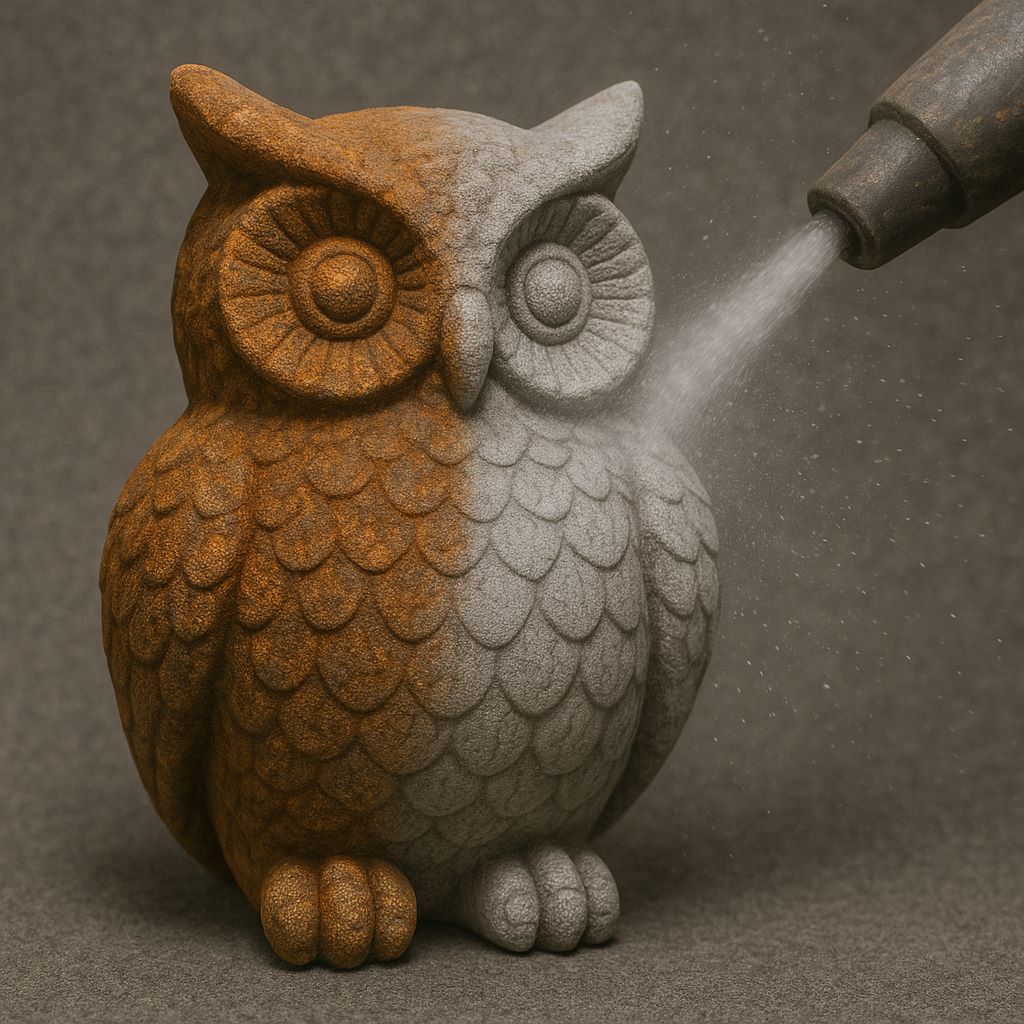 Application du mélange eau + abrasif sur la surface. Le nettoyage est progressif, maîtrisé et homogène sur toutes les zones, même difficilement accessibles.
