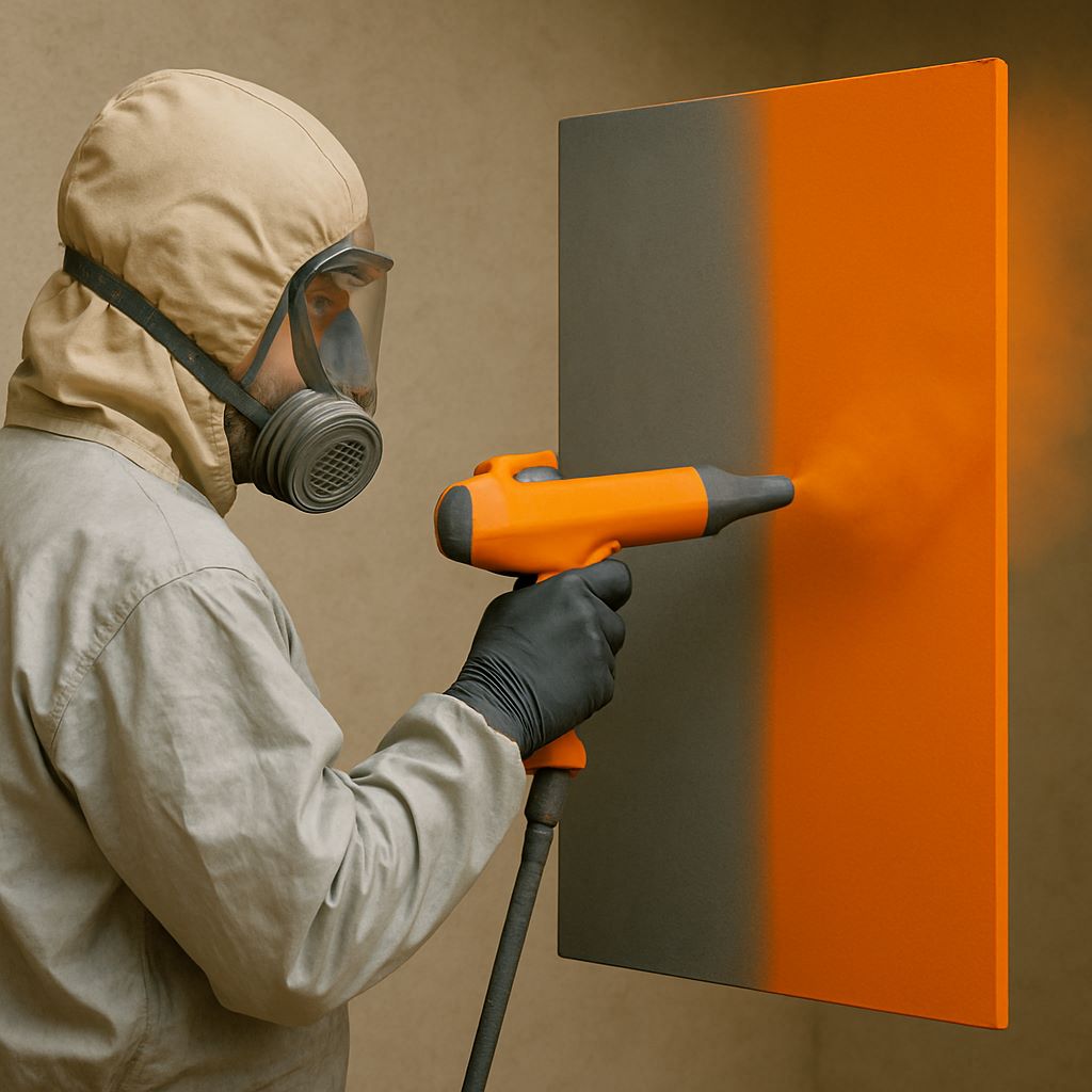 Thermo-laquage : application électrostatique d’une poudre colorée, suivie d’une cuisson au four (160–200°C) pour polymérisation.